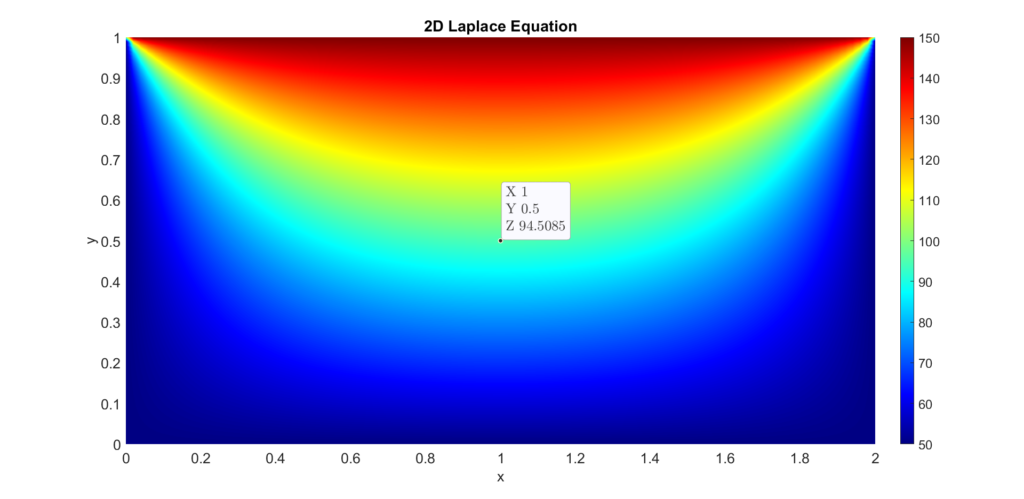 According to the problem, we will try to determine the temperature at the midpoint of the rectangular plate. Equation 1 is the heat equation in 2D cartesian coordinates with constant thermal conductivity.
